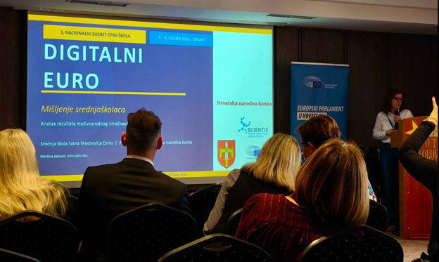 Koordinatorica je predstavila projekt koji je do sada najopsežnije istraživanje stavova hrvatskih srednjoškolaca o digitalnom euru. Proveden u suradnji s Hrvatskom narodnom bankom, projekt je obuhvatio 38 škola i više od 1.100 učenika iz Hrvatske te 5 škola iz inozemstva.