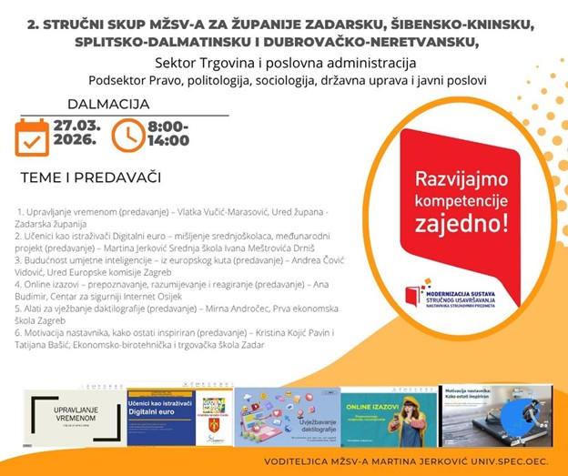 Koordinatorica projekta i učenica drugog razreda ekonomskog smjera Tina Buzov sudjelovale su na radionici Digitalna financijska pismenost u Hrvatskoj, koju su organizirali Ministarstvo financija RH, Hrvatska narodna banka, HANFA i OECD uz podršku Europske komisije. Znate li da samo 13% učenika zaista razumije što je digitalni euro – iako je 64% za njega čulo? Upravo ovakvi projekti mijenjaju tu sliku!Nastavnica Martina Jerković predstavila je rezultate međunarodnog istraživačkog projekta "Digitalni euro – mišljenje srednjoškolaca" u kojemu je sudjelovalo čak 1.082 učenika iz 38 hrvatskih škola i 67 učenika iz 5 europskih zemalja. Projekt realiziran uz suradnju s Hrvatskom narodnom bankom i podršku Šibenkos-kninske županije. Tina je pred stručnjacima iz cijele Hrvatske i OECD-a, govorila o aktivnostima u projektu te poručila nešto što vrijedi zapamtiti: "Nisam ni znala koliko toga ne znam – projekt me natjerao da počnem razmišljati o financijama na ozbiljniji način."